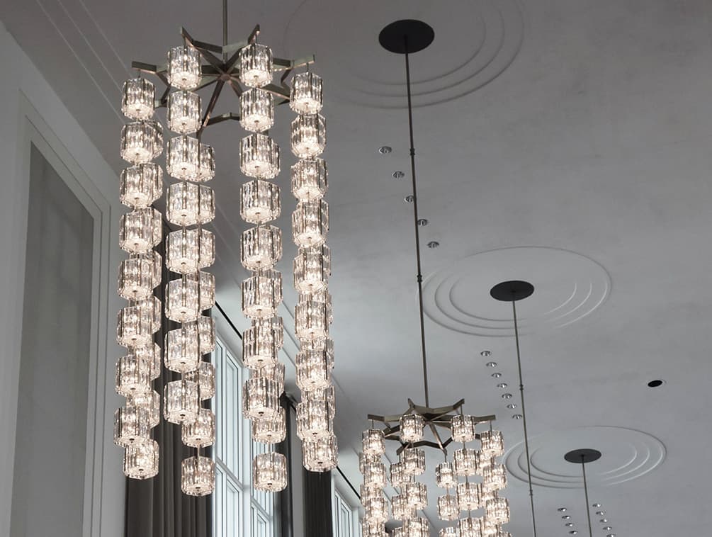 But some of the loveliest donations are the chandeliers given by Sweden. Made by Orrefors and gifted in 1967, 16 chandeliers hang in the foyer–each piece a hexagon, strung and illuminated.